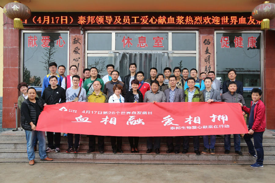 2016年4月16-17日,為迎接“第28個世界血友病日”的到來,山東泰邦生物制品有限公司組織員工五十余人到寧陽漿站舉行了捐獻血漿公益活動。活動以“血相融· 愛相擁”為主題,旨在以泰邦人的實際行動號召更多的愛心人士加入到獻漿隊伍,提高公眾對于血友病(凝血功能障礙遺傳性疾病)的關注度,喚起全社會對于血友病患者的關愛和支持。